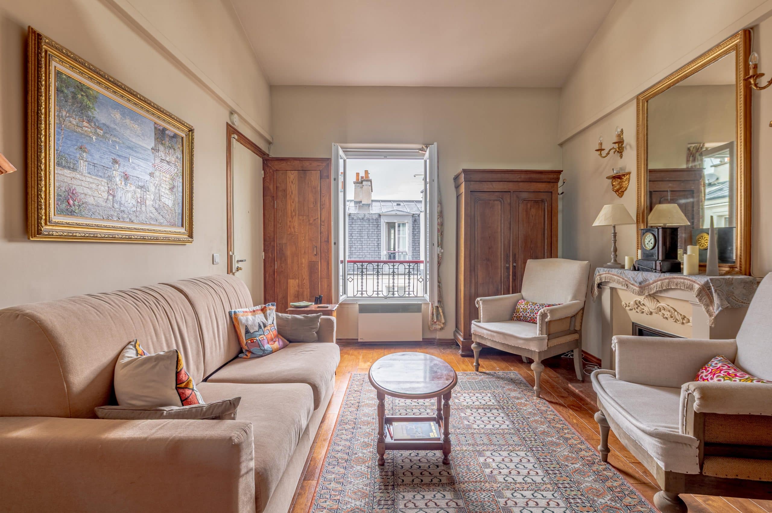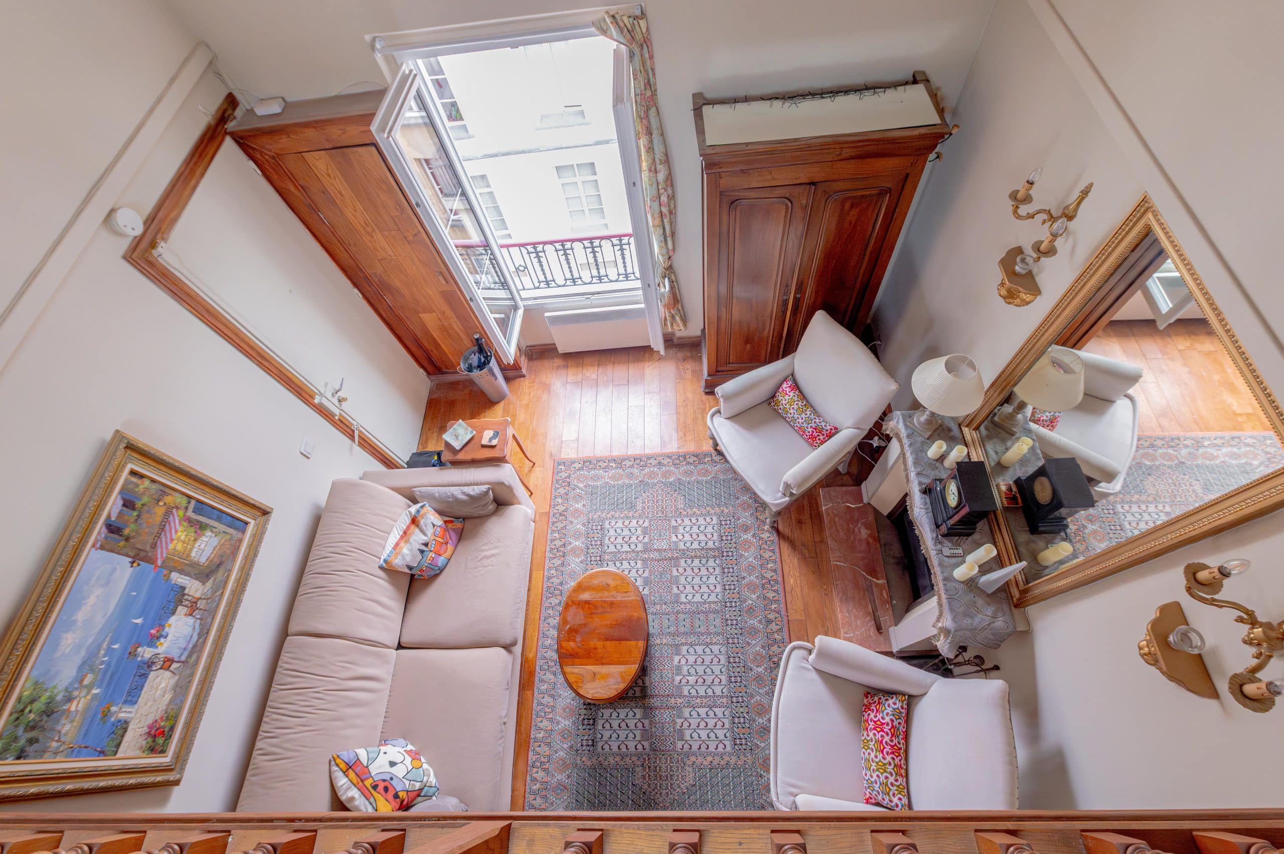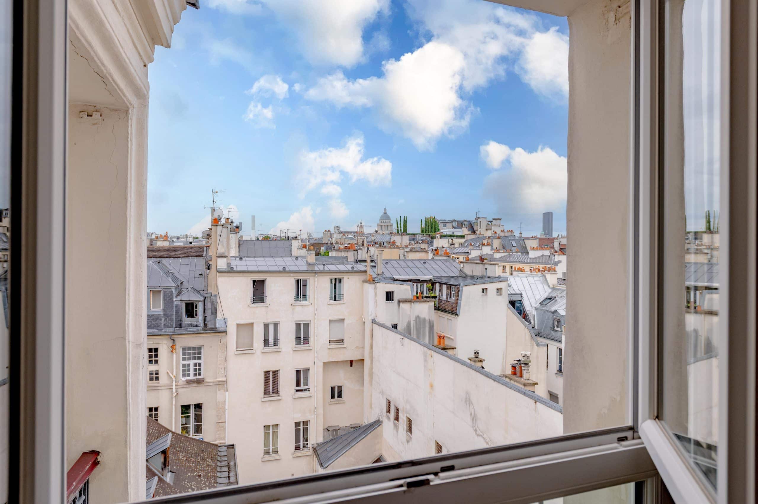 The apartment includes a cozy living area with courtyard views, a fully equipped kitchen, a tranquil lofted bedroom, and a classic Parisian bathroom. Large windows flood the space with natural light and frame postcard-worthy views of both quiet courtyards and iconic rooftops.